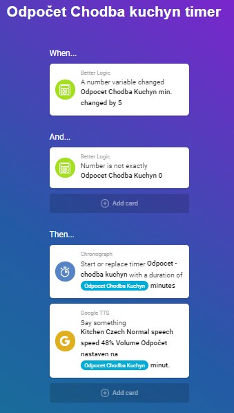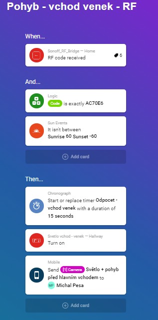 Hi, i have one special problem. I have flow for turn light ON when RF PIR detect move in front on the door. Next flow turn light in hallway, when i click on RF wall switch. I create flow for set time to light switch on, when person repeatly push button, and settings time is say in TTS (google home mini). Interesting is, that door PIR detect move, GHM say, that is settings time for 30min, when it detect again say time +30min and so on. All other works perfect. Is any idea, when can the porblem be?