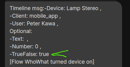 How should I interpret the result? I guess the first two are the device name and device ID. Is the zero comes from the "Number " tag? And the tick is showing if it switched on or off?