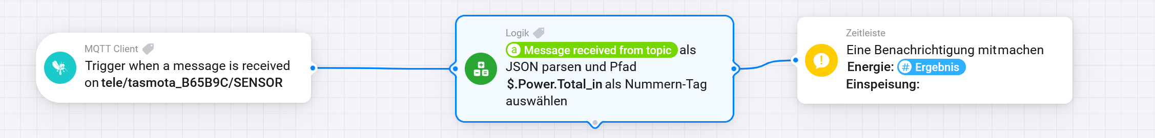 Alternativ sollte es doch mit einem Homey Script funktionieren, oder? Ich habe bereits etwas mit ChatGPT rum gespielt. Im Großen und Ganzen sehen die Scripts auch ganz logisch aus, soweit ich das überhaupt beurteilen kann. Woran ich bei den Scripts momentan scheitere, ist die Übergabe des Topic Inhalts von der MQTT Client App in das Script.