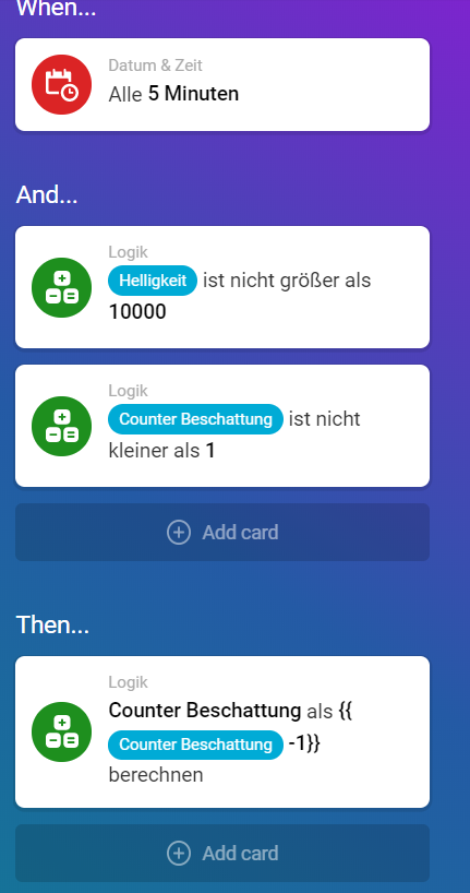 kannst Du mir bitte nochmal bei der Erstellung einer Sonnenschutzsteuerung helfen. Ich bin ja immer noch beim probieren (Homee-Geschädigter). Das mit den Countern habe ich noch nicht ganz verstanden, wie erstelle ich den? Oder die?