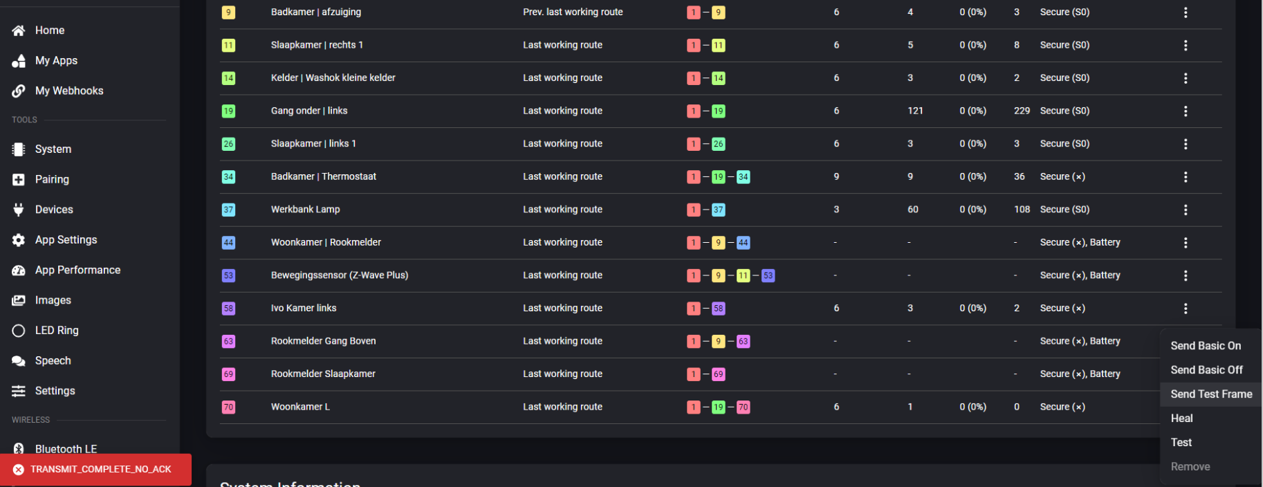 Zal even kort de situatie uitleggen. 2017 heb ik mijn huis voorzien van Fibaro modules (sensoren, schakelaars, slimme stekkers en rookmelders.) i.c.m. Hue verlichting. De keuze toentertijd gemaakt omdat Z-wave het neusje van de zalm was. Nu loop ik tegen 1 schakelpunt aan wat problemen oplevert. Ik heb de module al gereset en ook gekeken voor een firmware update (via Fibaro Homecenter (deze draait alleen als ik firmwares wil updaten of analyseren) want ik dacht namelijk dat dit aan de module lag (FGS-223). Nu heb ik ook nog een reserve (FGS-223 met witte sticker) en exact dezelfde actie uitgehaald en krijg dezelfde resultaten. Mijn homey hangt op in de meterkast en is 1.5 m afstand tussen dit schakelpunt en de homey. (hier tussen zit nog 1 module (genaamd gang).