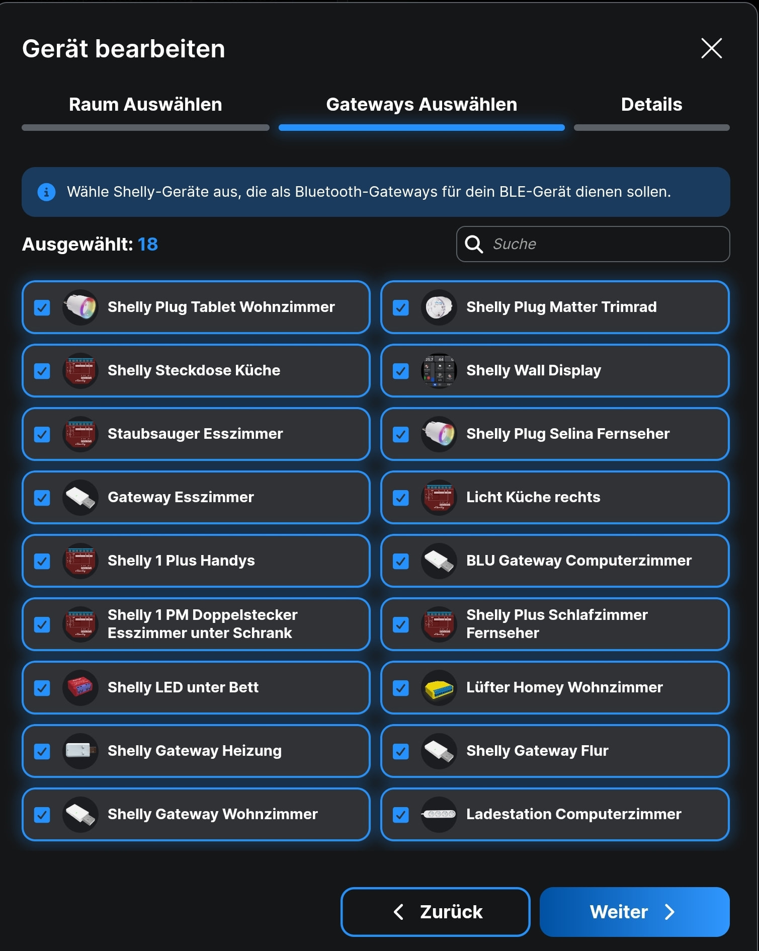 Als zweiten Step musst du in die Shelly App. Jetzt ruf bitte das BLU Gerät auf. Oben rechts auf den Stift gehen. Jetzt oben mittig auf Gateways gehen und alle Haken setzen.