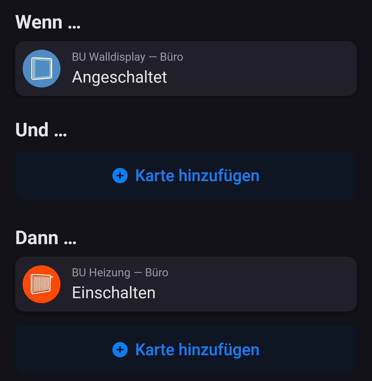 bisher habe ich das Walldisplay im direkten Zusammenspiel mit einem Shelly Plug als Thermostat genutzt, um einen Elektroheizkörper zu steuern. Das funktioniert an sich auch ganz gut und so wie es soll. Zu kalt, der Plug wird als Aktor vom Thermostat eingeschaltet, Temperatur erreicht, der Plug schaltet ab. Das ganze funktioniert also an Homey vorbei.