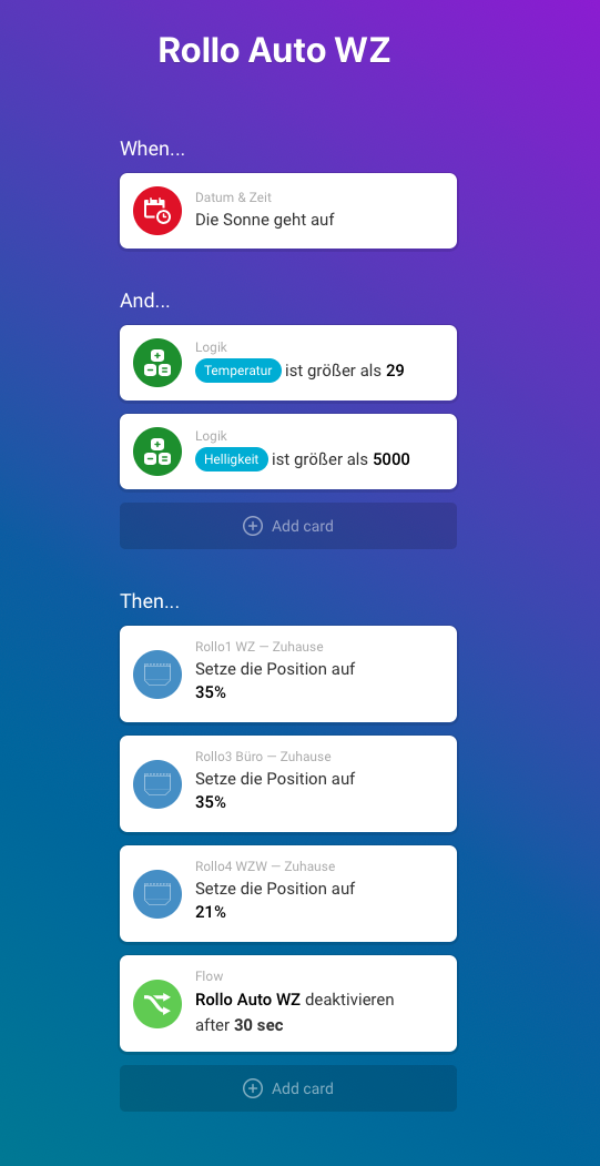 Der Flow wird aber nur vollständig ausgeführt, wenn in diesem kurzen Moment die Helligkeit bereits über 5.000 Lux (was in unseren Breitengraden vermutlich nie der Fall sein wird) und die Temperatur über 26 °C liegt.
