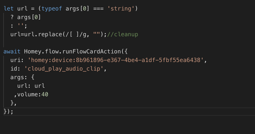 okay, gave up on getting sonos say to work. TTS google services does render a fine mp3. it plays from a browser and it plays if i hardcode the url in sonos play audioclip… but it does not play if i use the [Url] tag, so something is lost during encode/decode of the tag. Maybe a space is added in front of the url? can i maybe call that sonos play audioclip card from homeyscript?