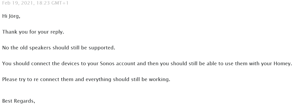 Also the line in the readme from the Homey app is not correct. Where it says “Note: Only Sonos S2 speakers are supported.” it should have stated something like “Some of the new functions will not work on older speakers” or something like that.