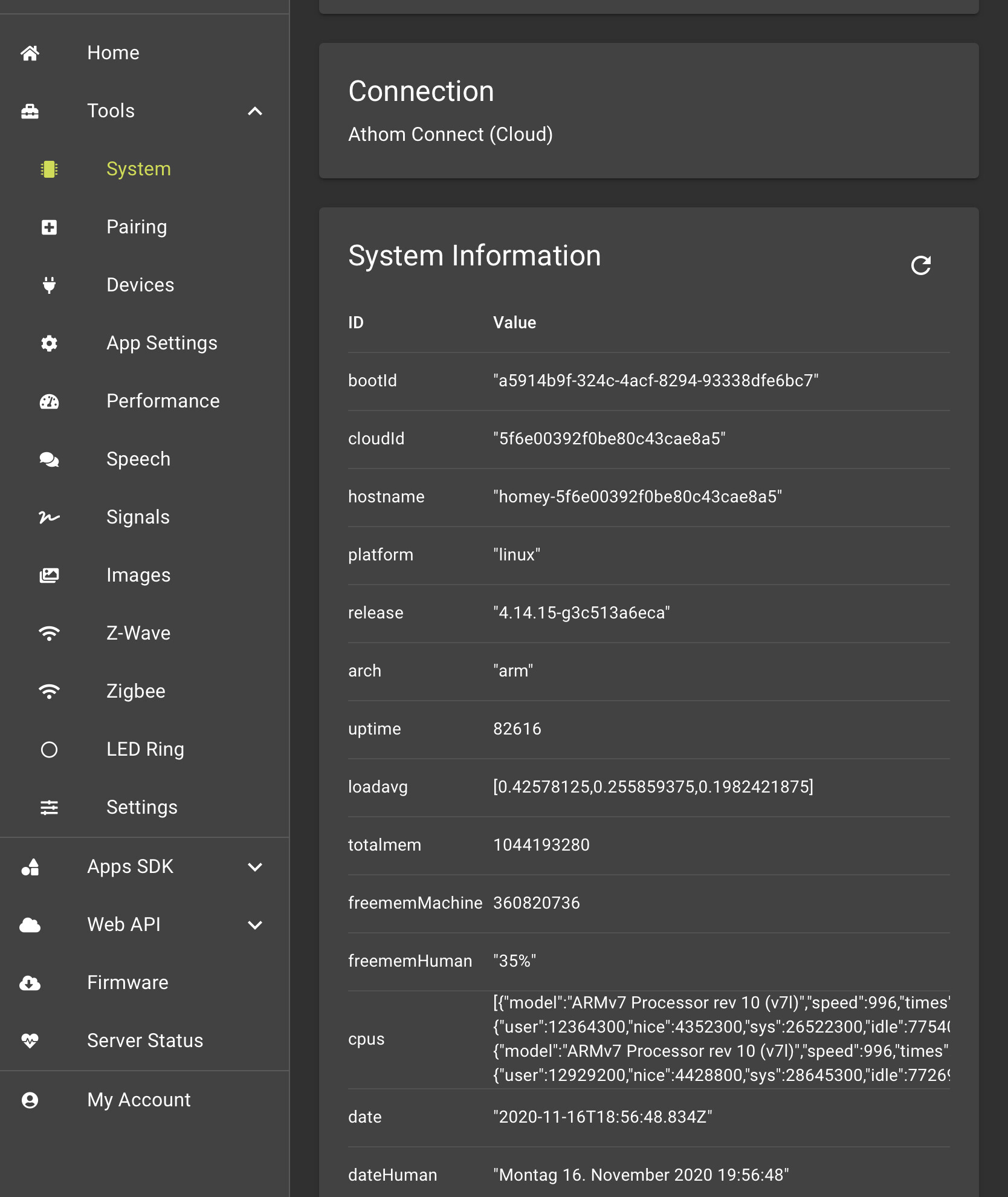 Unter https://developer.athom.com/tools/system wird ein freememhuman von 35% angezeigt, in der Homey App komme ich auf 65% freien Arbeitsspeicher (347,8 mb belegt)