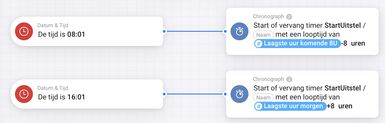 Ik heb het eens getest. Maar dat werkte niet bij mijn machines. Start uitstel werkt ook prima. De gedachte is als er goedkope stroom is dan is waarschijnlijk de productie van de zonnepanelen ook hoog. Dus het gaat nog niet eens zozeer om de daadwerkelijke prijs, maar mijn eigen productie opstoken.