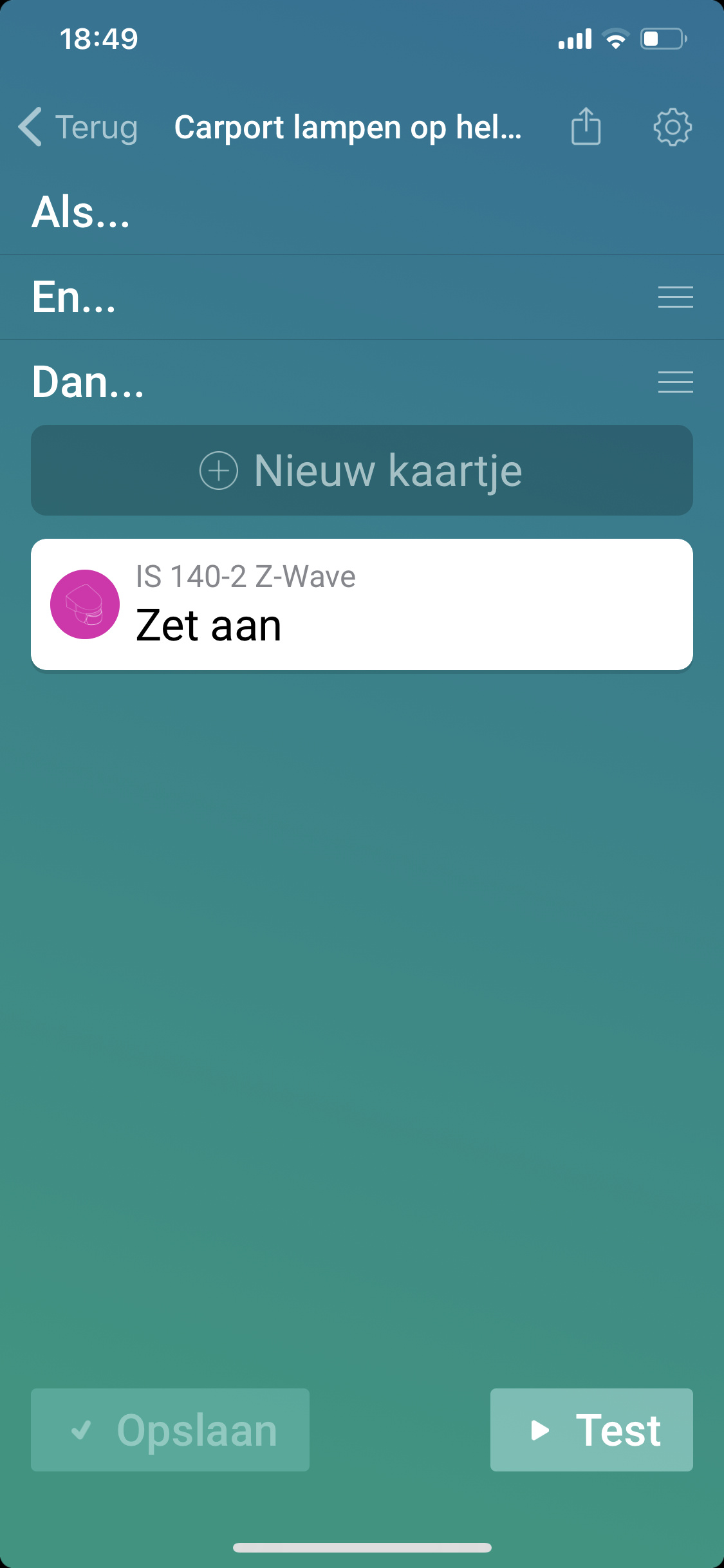 Door het zigbee protocol kan ik de sensor ook simuleren met de homey. Dan kan ik dus de sensor “aan” zetten waardoor de lampen onder de carport gaan branden. En viceversa.