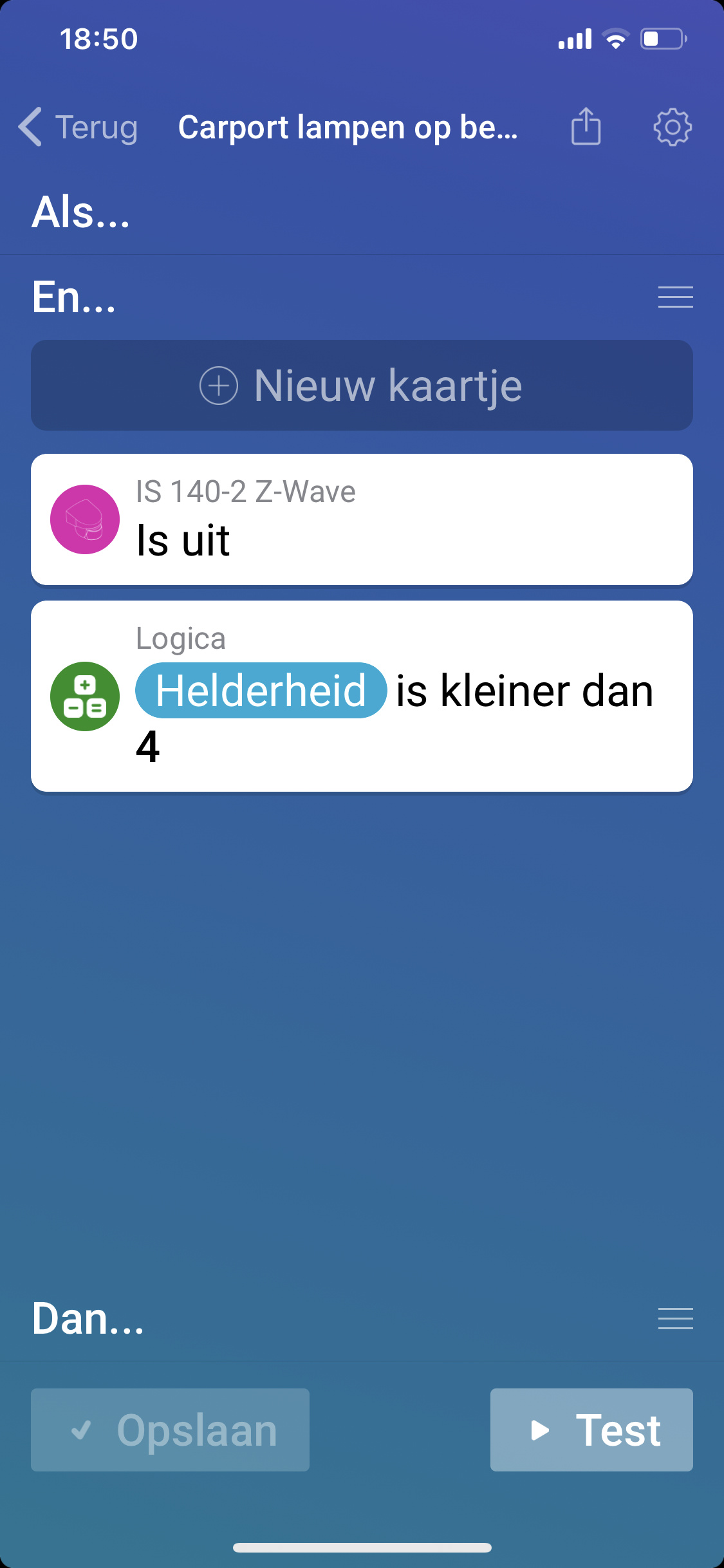 Als de lux onder de 4 komt dan gaan mijn lampen onder de carport aan. Dus de sensor aan. Totdat ik op de virtuele knop slapen druk. Dan gaan
