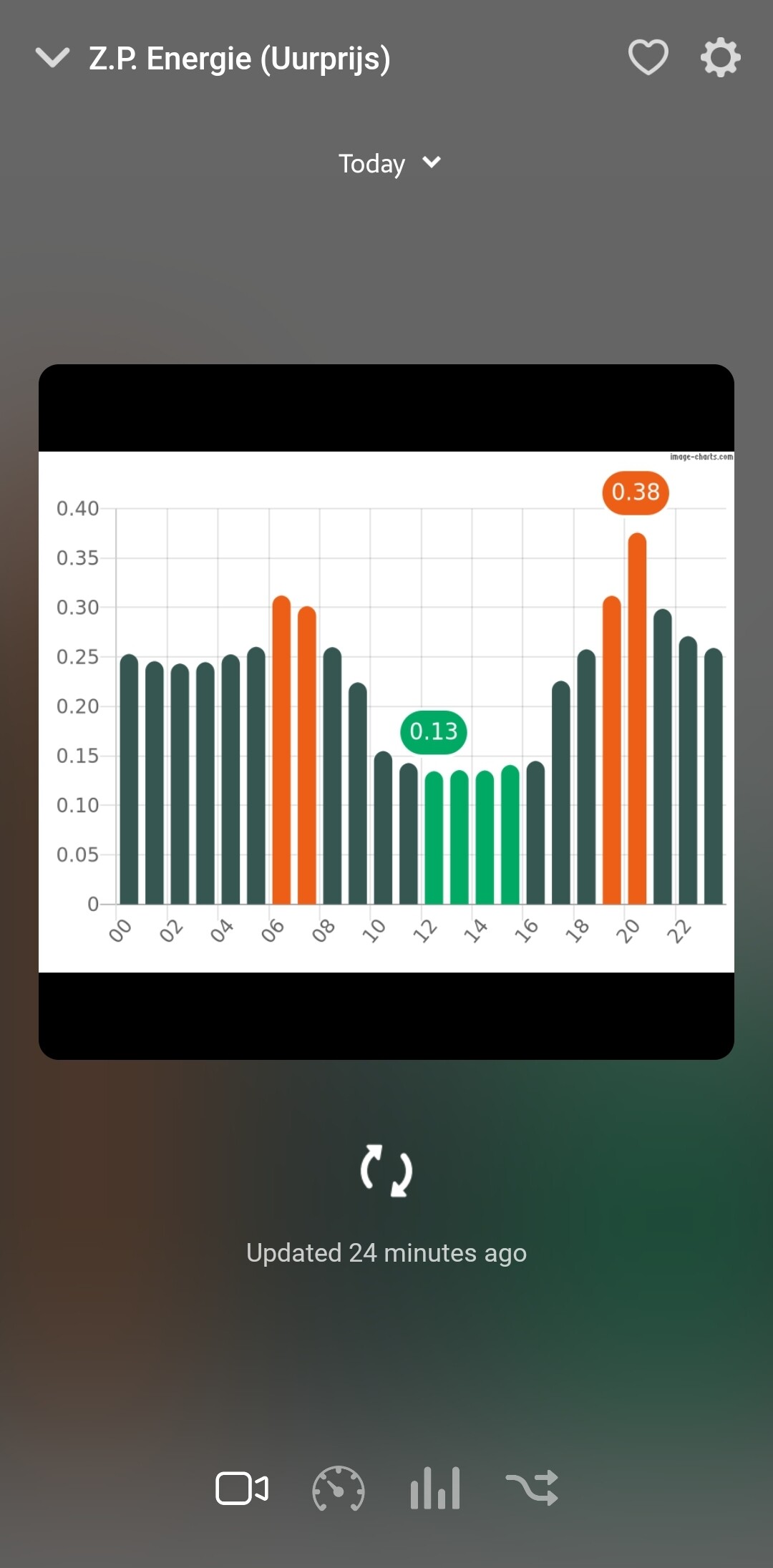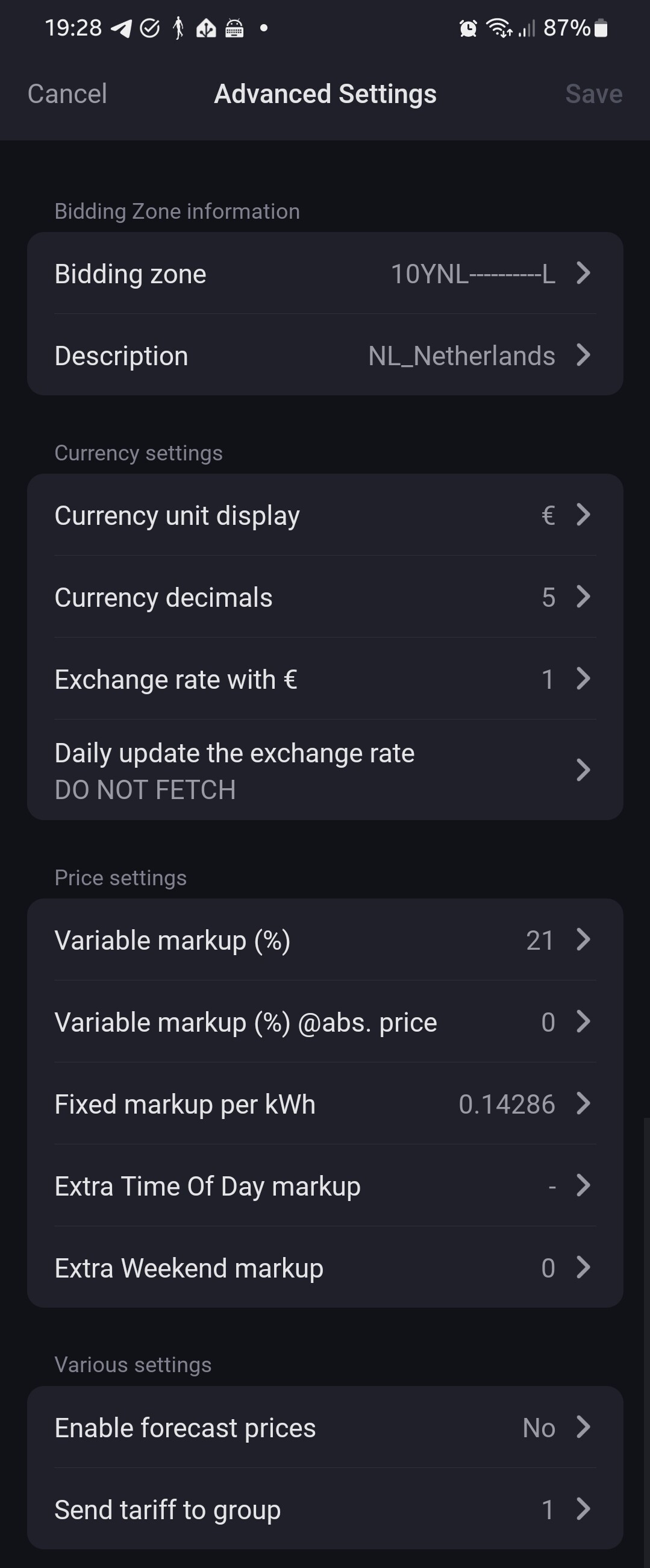 With the “Daily E-ahead prices” device, which is being “fed” by those prices (fully automatic without flows), you can configure it to match your cost and tariffs. F.i. you can enter a fixed markup, like VAT: