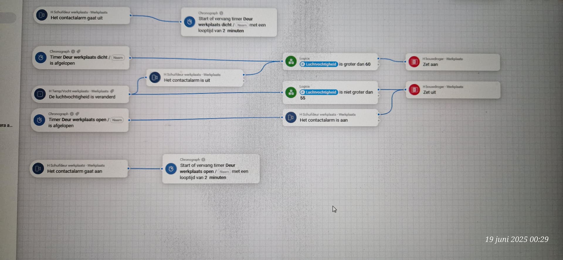 maar het idee is als de deur meer dan 2 min open is dan gaat de bouwdroger uit en pas als de deur weer 2 minuten dicht is gaat hij weer aan, dit om te voorkomen dat hij aldoor gaat schakelen zodra je door de deur stapt.