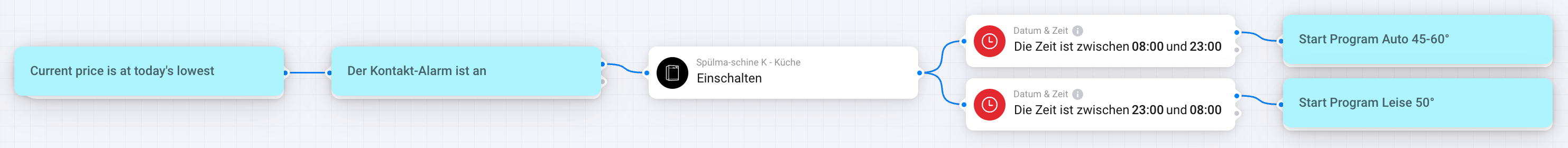 Nachteil des 2. Flows ist allerdings, dass dieser bei jeder Preisänderung getriggert wird, egal ob der Preis niedrig oder hoch ist. Der läuft zwar auch nur dann bis zum Ende durch und startet die Spülmaschine, wenn alle anderen Bedingungen korrekt sind, aber mit dem 1. Flow kann man sich das unnötige Triigern sparen, was wiederum eine (sehr kleine) Entlastung für den Homey ist.