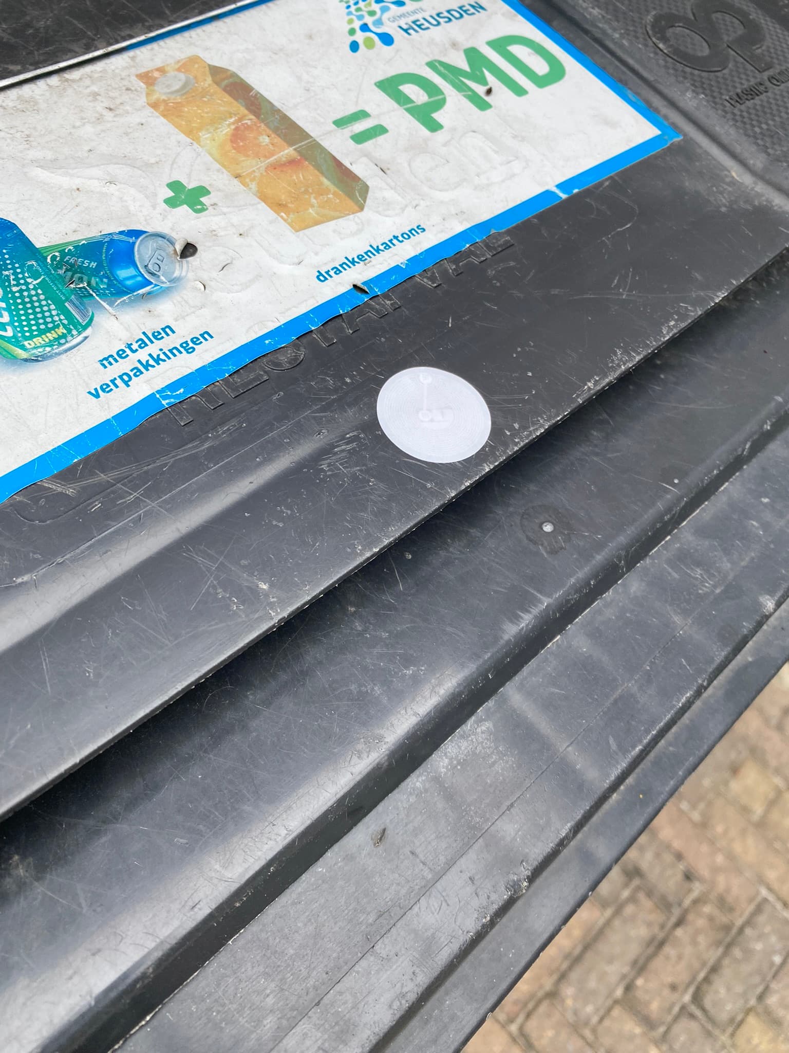 Ik heb dus op elke container een goedkope NFC tag (sticker) geplakt. Ik neem in dit voorbeeld even de grijze PMD container, maar voor de GFT of andere containers werkt het hetzelfde.