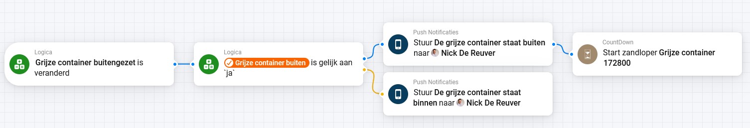 Wij zetten de container vaak 's avonds aan de straat de dag voordat deze opgehaald wordt zodat we het niet vergeten. Daarnaast wordt de container bij ons in de buurt vroeg geleegd, dus als ik hem om 8:00 buiten zet ben ik wel eens te laat geweest. Ik heb dus een flow gemaakt die als volgt werkt: