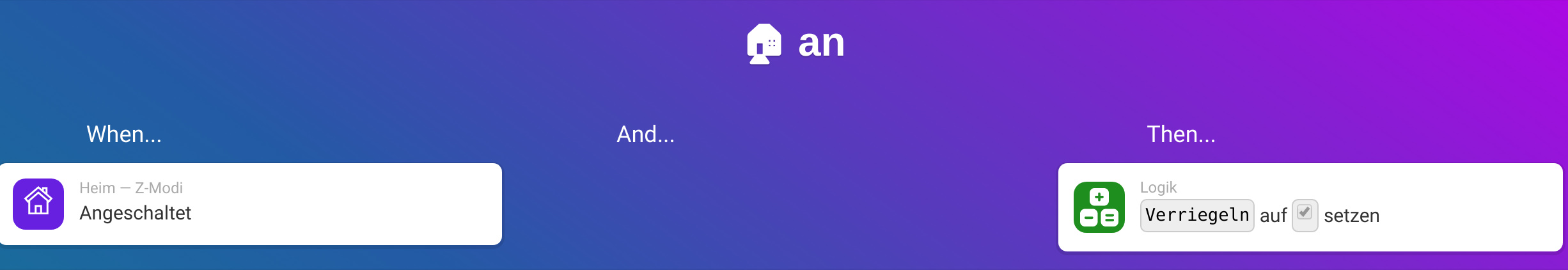 Nach dem Du den Modus Urlaub oder Abwesend aktiviert hast soll beim Schließen der Tür diese verriegelt werden. Dabei spielt es keine Rolle wieviel Zeit zwischen Modus aktivieren und Haus verlasen vergeht. Diese Funktion soll in einem Zeitraum „x“ aktiv sein, falls du was vergessen hast und noch mal ins Haus muss, dann soll beim Schließen der Tür diese ebenfalls verriegelt werden.