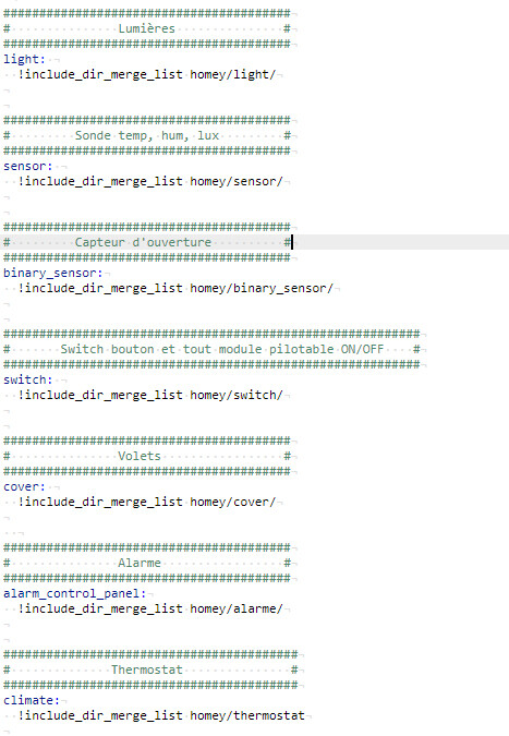 Pour éviter de rendre votre fichier « confiration.yaml » très vite imbuvable ou de faire une bourde, et afin de vous y retrouvez, je vous conseille de créer un dossier dans lequel vous mettrez tous vos « devices ». Pour ma part je l’ai nommé « homey » tout simplement.