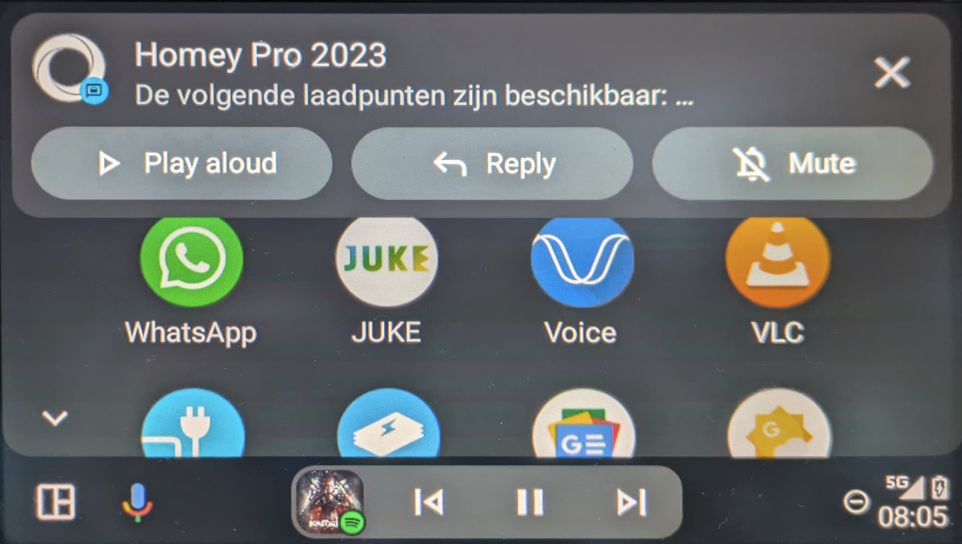 With the help of ChatGPT, I created a HomeyScript that informs me about which charging stations are available. This notification is then sent to my phone, allowing me to play it out loud through Android Auto while I’m driving. This way, I know exactly which charging stations are free and where to drive to charge my car.