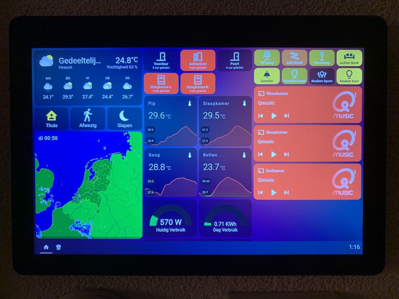 Used a Raspberry Pi 3b+ with Home Assistant latest version, iOS Dark Theme, and some custom apps like âmini graph cardâ , âbuienradarâ and âbutton-cardâ . Every sensor/switch/thermostat is loaded from Homey with MQTT except Sonos, which got added to HA directly so I could use the mediaplayer widget (auto discovered).