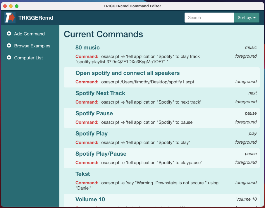 So to get this to work, you need to create a bunch of commands in TriggerCMD using the GUI editor in the agent running on the Mac. You will need one for each command you want to send to AirFoil - so one to connect and another to disconnect each speaker, and perhaps one to increase the volume and another to decrease the volume of each speaker. Maybe also commands to change the audio source for AirFoil if you want to switch between different apps such as iTunes or VLC.