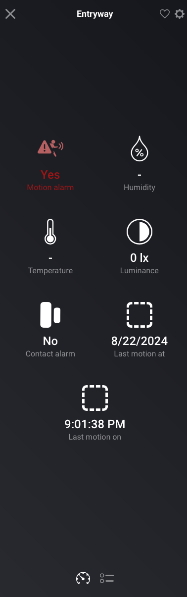 I am brand new to Homey… My first Advanced flow challenge is to create a flow that turns on the entry lights when motion detected there and then off after x minutes. I am using a UniFi Protect Sensor, motion and LUX enabled. The motion alarm has gone off on the sensor, 4 hours ago when I first installed it and it is still flashing “YES Motion Alarm”. There seems to be TWO motion icons, one reports motion with a date and when I hover the mouse over, indicates 4 hrs ago. The other reports Last motion but time. THIS one is realtime and reports immediately when there is motion.