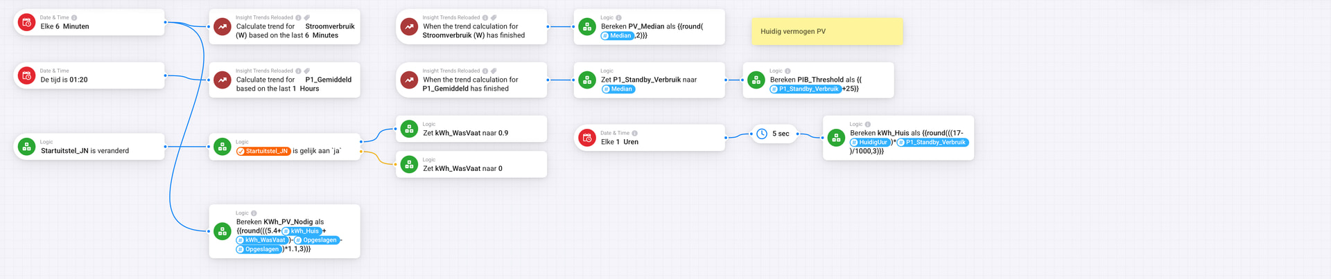 Om toch wat laag hangend fruit van de energiemarkt te plukken heb ik een flow gemaakt om het laden van de batterij uit te stellen totdat de marktprijs het laagste is. Ik maak daarbij gebruik van de energie voorspelling van Solcast om te bepalen of de batterij normaal moet werken, of dat deze stand-by gezet mag worden. (je wil natuurlijk wel tegen de avond een volle batterij)