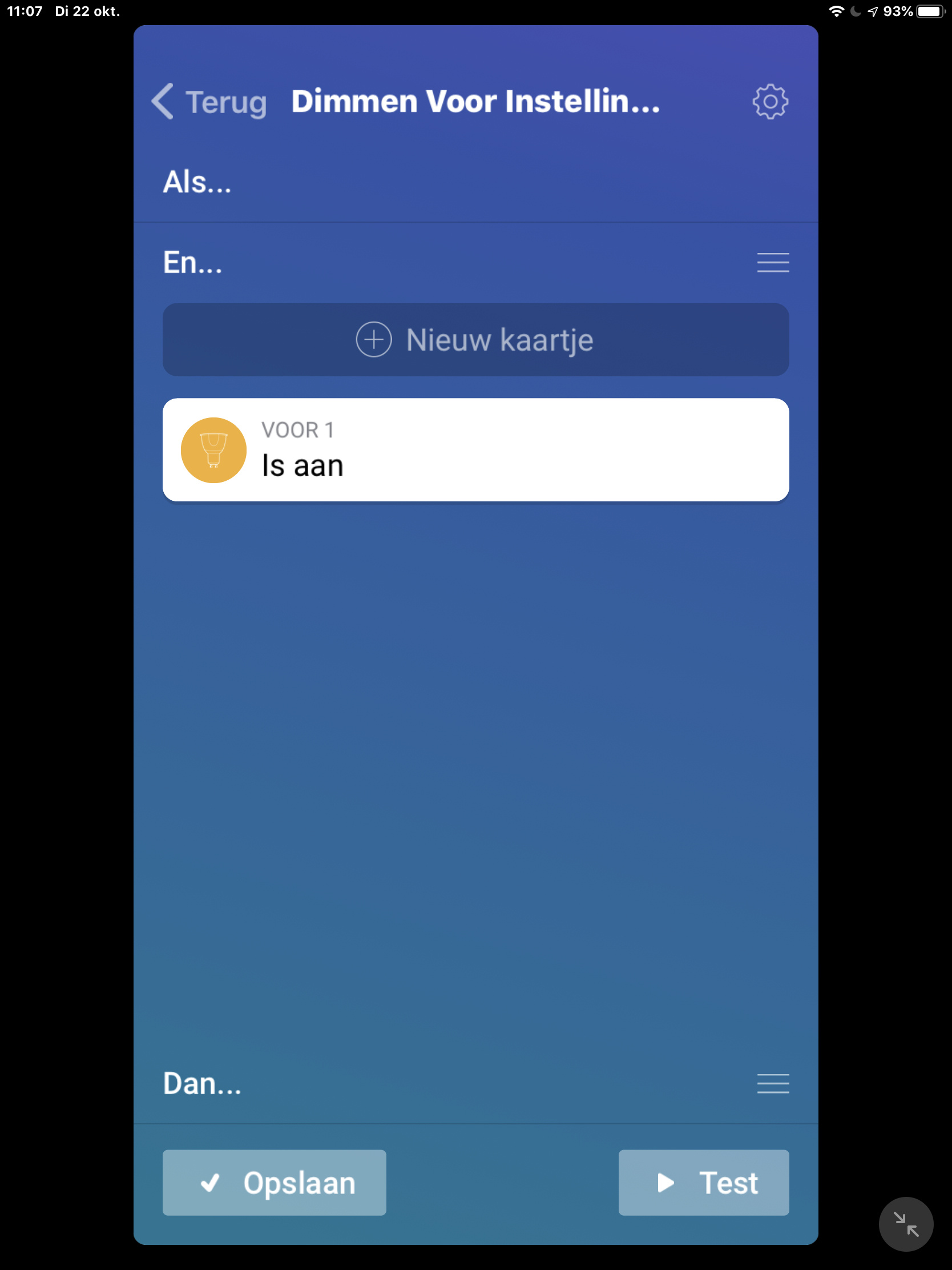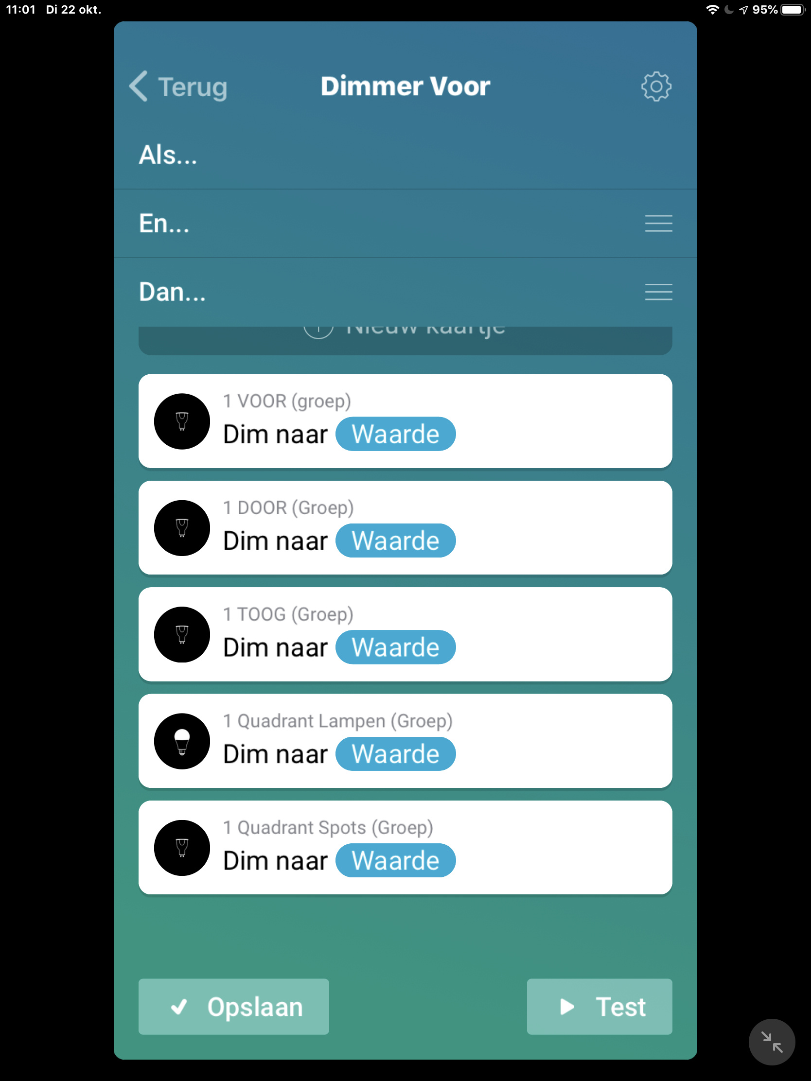 Ziet er op zich goed uit, alhoewel ik twijfel aan de hoeveelheid "Dim naar " kaartjes die je gebruikt. Dat zijn groepen, dus ik neem aan dat ook daar weer meerdere lampen achter zitten? Om hoeveel lampen gaat het in totaal?