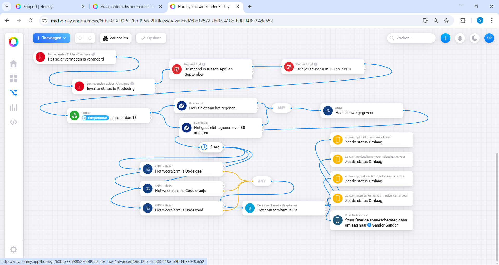 Graag zou ik geautomatiseerd hebben dat de screens uit gaan bij warm weer. Ik weet niet zo goed waardoor de flow vastloopt.