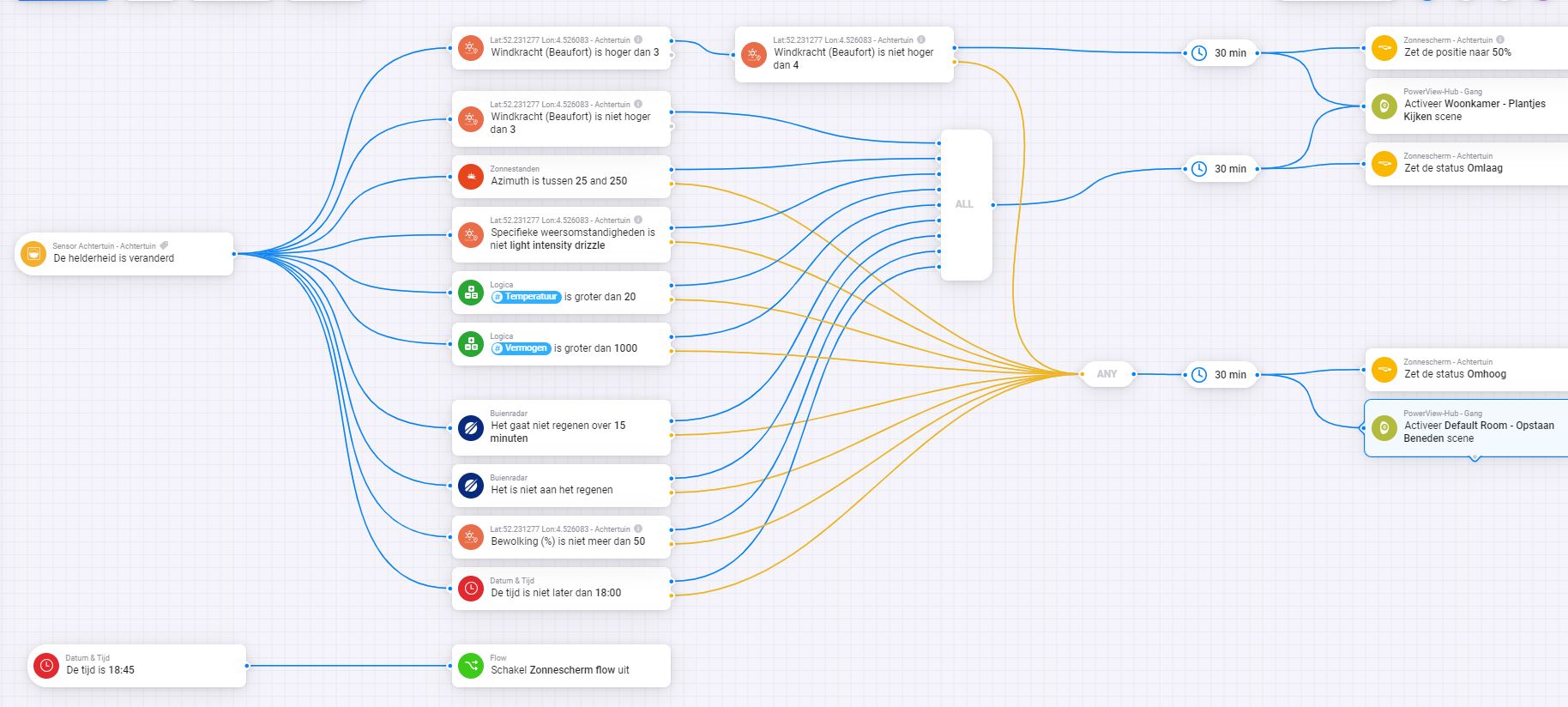 Ik heb een advanced flow voor het zonnescherm en de duettes in de woonkamer gemaakt. In de flow zijn wachtkaarten van 30 minuten opgenomen. Deze zijn bedoeld om in en uitklappen van het zonnescherm te beperken als er even een wolk voor de zon komt.