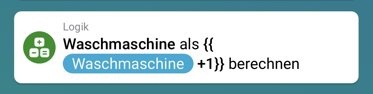 Im 2. Flow bei Dann… die Logikkarte „Eine numerische Variable berechnen“ einfügen. Als Objekt die zuvor erstellte Variable Waschmaschine auswählen. Bei Wert folgende Berechnung eingeben: {{Waschmaschine+1}}