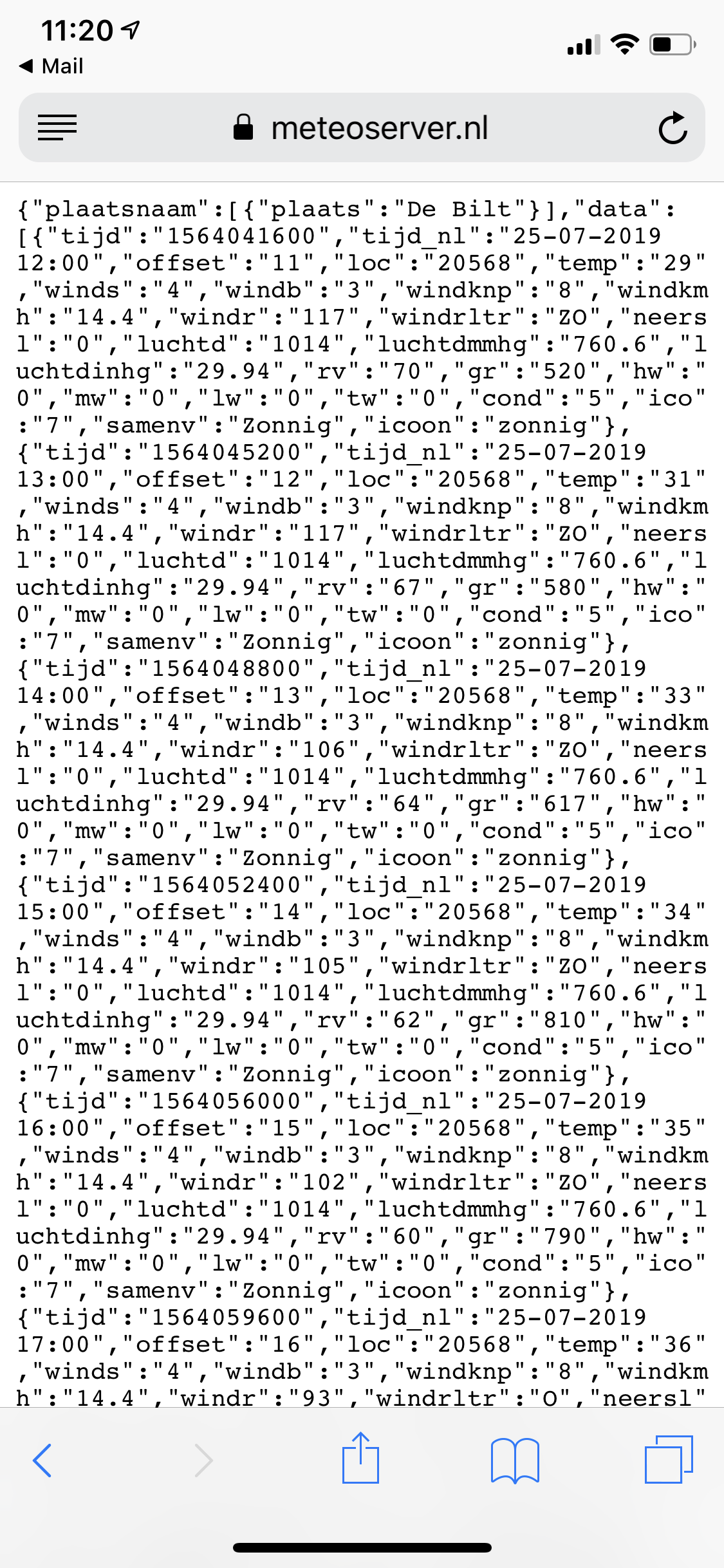 { “liveweer”: [{“plaats”: “Waddinxveen”, “temp”: “3.2”, “gtemp”: “-2.2”, “samenv”: “Geheel bewolkt”, “lv”: “99”, “windr”: “ZZW”, “windms”: “8”, “winds”: “5”, “windk”: “15.6”, “windkmh”: “28.8”, “luchtd”: “1016.3”, “ldmmhg”: “762”, “dauwp”: “3”, “zicht”: “1”, “verw”: “Bewolkt en lokaal mist. Morgen regen”, “sup”: “08:31”, “sunder”: “16:34”, “image”: “wolkennacht”, “d0weer”: “regen”, “d0tmax”: “10”, “d0tmin”: “5”, “d0windk”: “5”, “d0windknp”: “17”, “d0windms”: “9”, “d0windkmh”: “31”, “d0windr”: “NO”, “d0neerslag”: “63”, “d0zon”: “7”, “d1weer”: “regen”, “d1tmax”: “8”, “d1tmin”: “5”, “d1windk”: “3”, “d1windknp”: “8”, “d1windms”: “4”, “d1windkmh”: “15”, “d1windr”: “ZW”, “d1neerslag”: “90”, “d1zon”: “10”, “d2weer”: “halfbewolkt”, “d2tmax”: “9”, “d2tmin”: “8”, “d2windk”: “3”, “d2windknp”: “8”, “d2windms”: “4”, “d2windkmh”: “15”, “d2windr”: “W”, “d2neerslag”: “40”, “d2zon”: “10”, “alarm”: “0”}]}