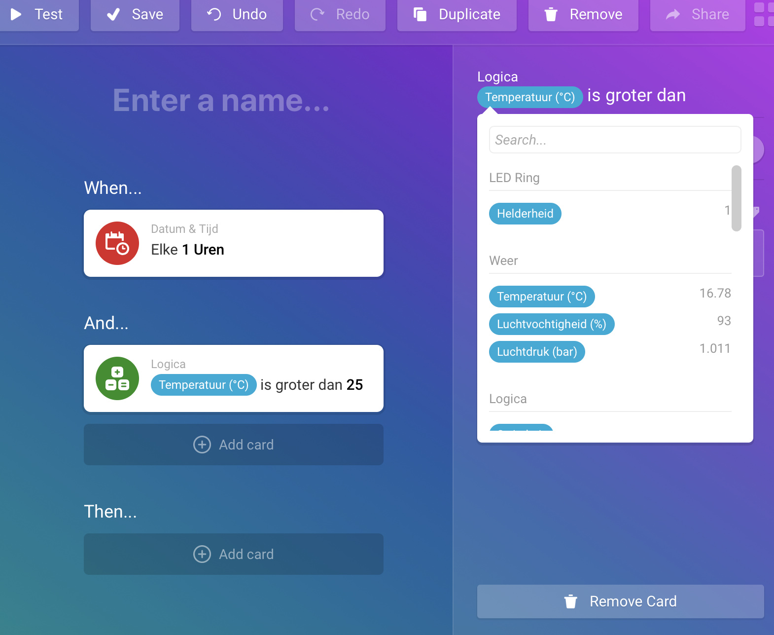 $.data[0].temp in. Let op; Er moet een dollarteken voor .data staan. Dit dollarteken valt om een vreemde reden weg in mijn reply. Dit is de temperatuur op 12 uur in de nacht, omdat ik deze flow een paar minuten voor 12 uur laat uitvoeren. In het tweede invulveld vul je naam van de variabele in waar je de temperatuur wilt hebben. bijvoorbeeld Temp24uur Deze variabele moet je van tevoren hebben aangemaakt in Better Logic.