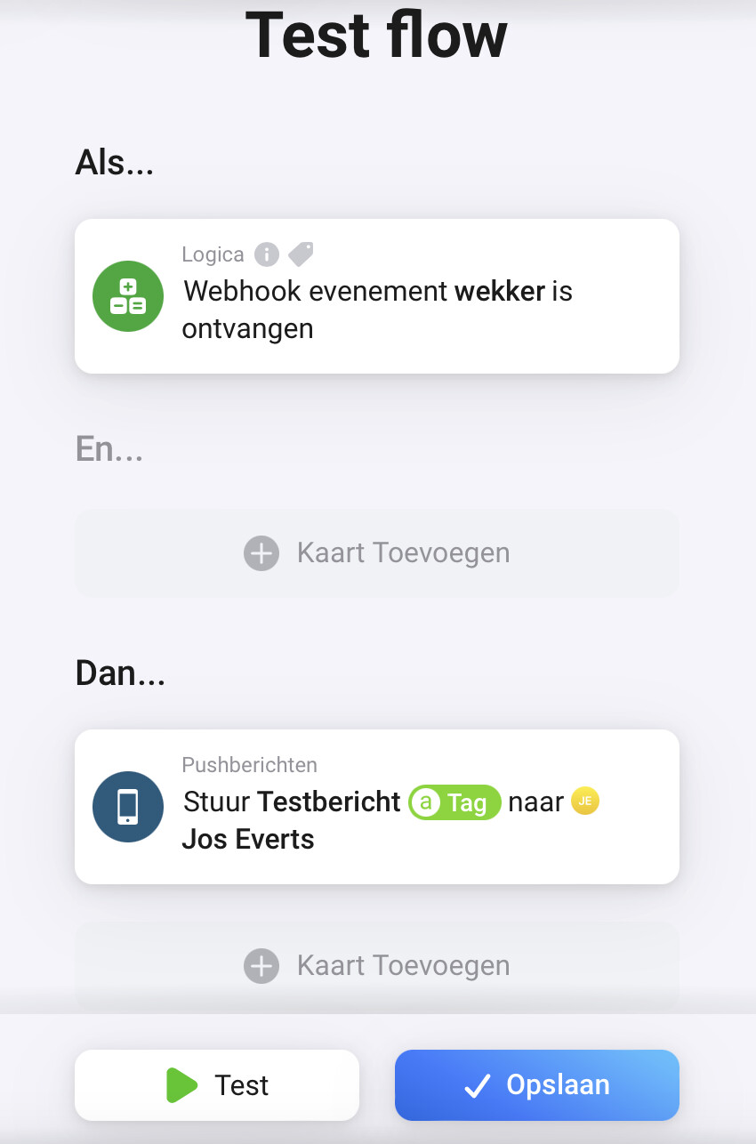 In Homey heb ik bij wijze van probeersel een flow met de naam test gemaakt die een pushnotificatie stuurt naar mezelf met de tekst Testbericht Tag, omdat ik ervan uitga dat de tag uit de Opdracht hier zou ingevuld worden. In het bericht staat echter niet de aangepaste datum (tijd), maar de tekst 'test’1. Kan je me verder helpen?
