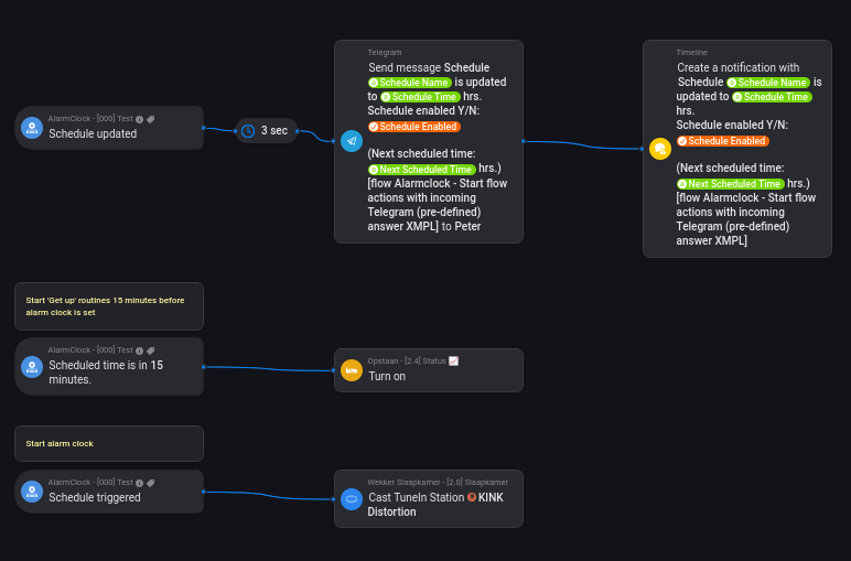 De flow wordt getriggerd door het antwoord op de Telegram vraag, en stelt het ‘Action Scheduler’ apparaat ‘Alarm Clock’ in op het gewenste tijdstip,