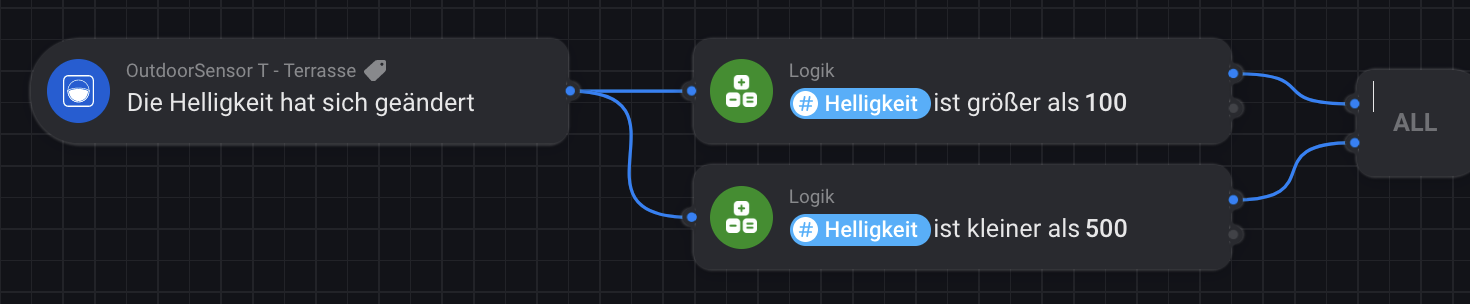 Bei diesem Flow wird allerdings die Aktion immer dann ausgelöst, wenn sich die Helligkeit ändert und der Wert zwischen größer und kleiner als liegt.