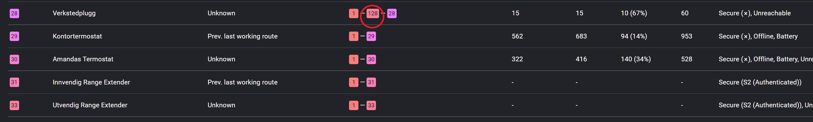 Jeg ser i Homey Developer Tools at ei av rutene gĂ„r via ukjente z-wave enheter. Jeg har p.t 33 enheter i lista, mens ei av rutene (til en Fibaro Wall Plug i verkstedet) gĂ„r via enhet nr 128 (merket med rĂžd ring). Her hadde jeg hĂ„pet at det skulle stĂ„ 33, nemlig den range extender som skulle ta seg av dette verkstedet. Denne Fibaroen (nr 28) er merket som âunreachableâ, og det er ogsĂ„ extenderen (av og til).