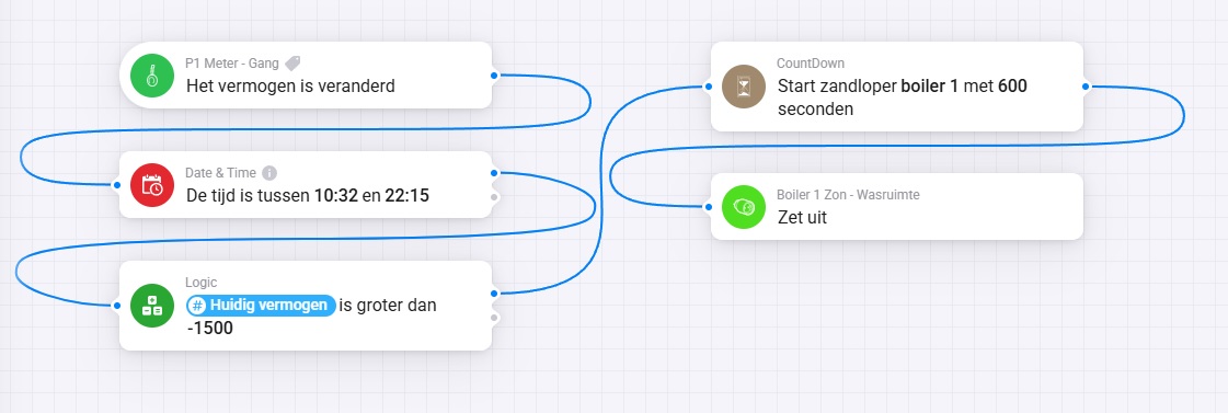 Overigens: als het vermogen weer onder de -1500 daalt wil je de zandloper stoppen zodat de boiler niet uitgezet wordt
