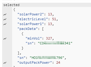 Leider scheitere ich momentan daran, die jeweiligen minVol, maxVol und SoC für den entsprechenden Speicher “sn”: xxx695 bzw “sn”: xxx341 in Variablen zu schreiben.